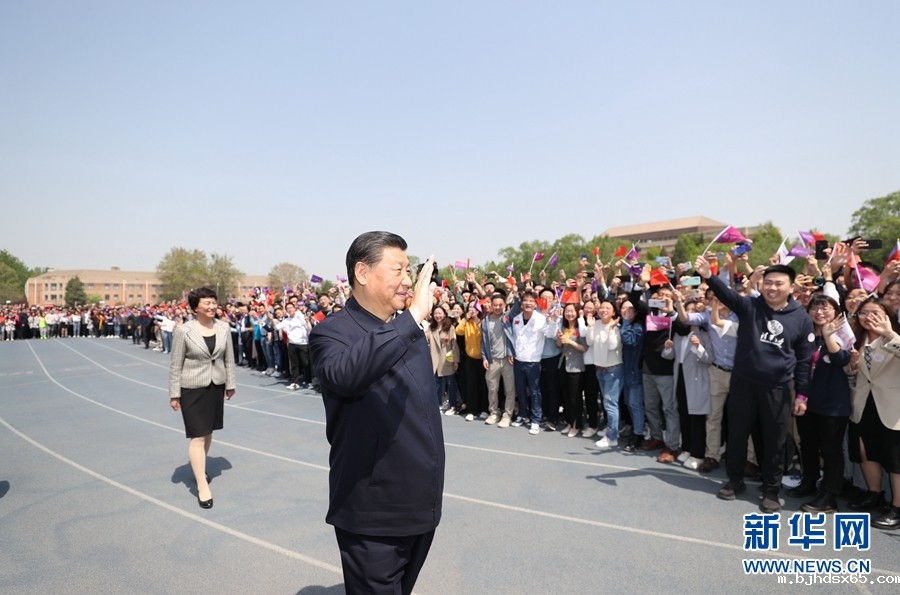 4月19日,在清华大学建校110周年校庆日即将来临之际,中共中央总书记、国家主席、中央军委主席习近平来到清华大学考察。这是习近平离开学校时,同师生们挥手致意。新华社记者 鞠鹏 摄