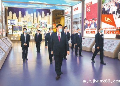 气势磅礴的长城主题漆画、马克思《布鲁塞尔笔记》第四笔记本手稿、一大会址复原场景、革命根据地的创建展板、遵义会议复原景观、党的七大投票箱、开国大典影像、抗美援朝战争中使用过的武器、《解放思想,实事求是,团结一致向前看》讲话提纲、创办经济特区图片、脱贫攻坚数据图表、火神山雷神山医院模型……珍贵的文物实物、翔实的档案资料、生动的图片视频、逼真的复原景观,吸引了习近平等领导同志的目光。他们不时停下脚步仔细观看,认真听取讲解,详细询问有关情况。