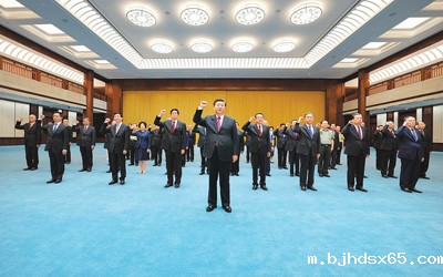 6月18日,党和国家领导人习近平、李克强、栗战书、汪洋、王沪宁、赵乐际、韩正、王岐山等在中国共产党历史展览馆参观“‘不忘初心、牢记使命’中国共产党历史展览”。这是参观结束后,习近平带领党员领导同志一起重温入党誓词。 |