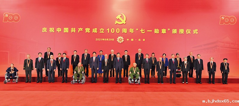 2021年6月29日,庆祝中国共产党成立100周年“七一勋章”颁授仪式在北京人民大会堂金色大厅隆重举行。习近平等领导同志同“七一勋章”获得者合影。 新华社记者 谢环驰/摄