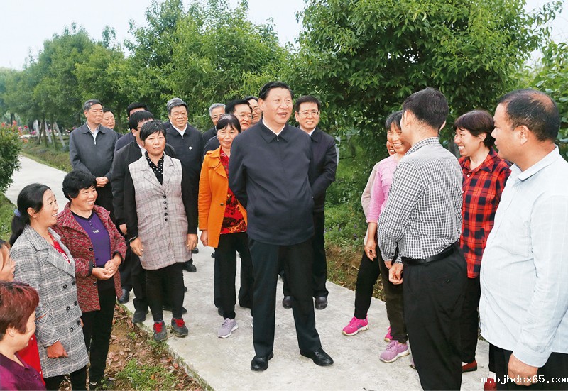 2021年5月14日上午,中共中央总书记、国家主席、中央军委主席习近平在河南省南阳市主持召开推进南水北调后续工程高质量发展座谈会并发表重要讲话。这是座谈会前,习近平于13日在南阳市淅川县九重镇邹庄村考察利用南水北调移民村产业发展资金建立起来的丹江绿色果蔬园基地,同村民亲切交流。 新华社记者 王晔/摄