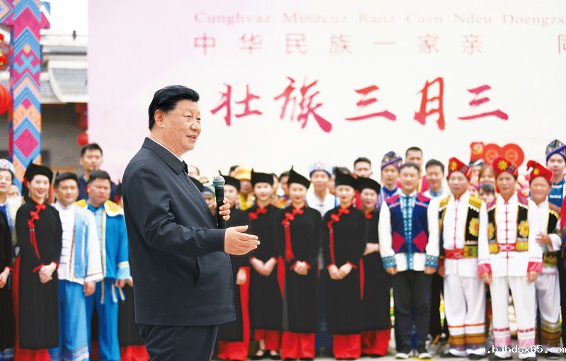 2021年4月25日至27日,中共中央总书记、国家主席、中央军委主席习近平在广西考察。这是27日上午,习近平在南宁市广西民族博物馆外,同参加三月三“歌圩节”民族文化活动的各族群众亲切交流。 新华社记者 谢环驰/摄