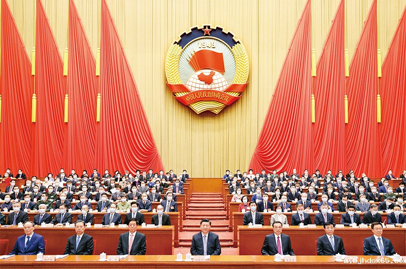 2022年3月4日,中国人民政治协商会议第十三届全国委员会第五次会议在北京人民大会堂开幕。这是习近平、李克强、栗战书、王沪宁、赵乐际、韩正、王岐山在主席台就座,汪洋代表政协第十三届全国委员会常务委员会向大会报告工作。 新华社记者 黄敬文/摄