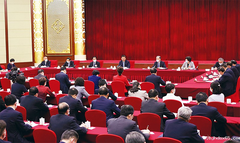 2022年3月6日,中共中央总书记、国家主席、中央军委主席习近平看望参加全国政协十三届五次会议的农业界、社会福利和社会保障界委员,并参加联组会,听取意见和建议。中共中央政治局常委、全国政协主席汪洋参加看望和讨论。 新华社记者 王晔/摄