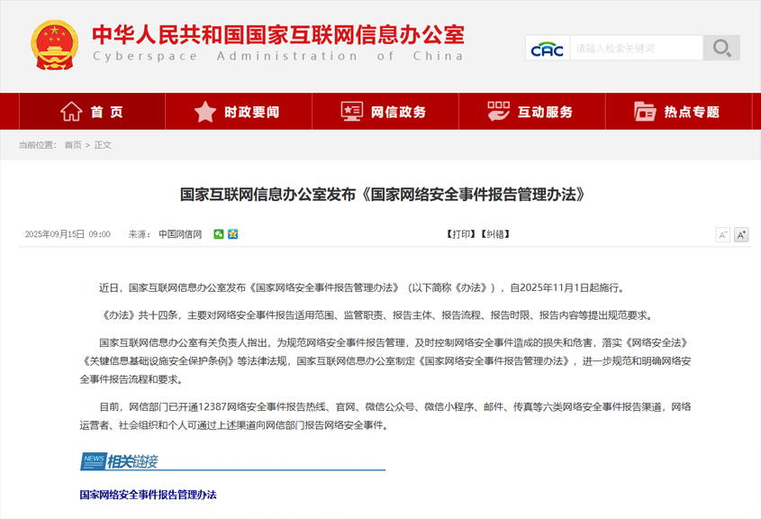 近日,国家互联网信息办公室发布《国家网络安全事件报告管理办法》(以下简称《办法》),自2025年11月1日起施行。 《办...