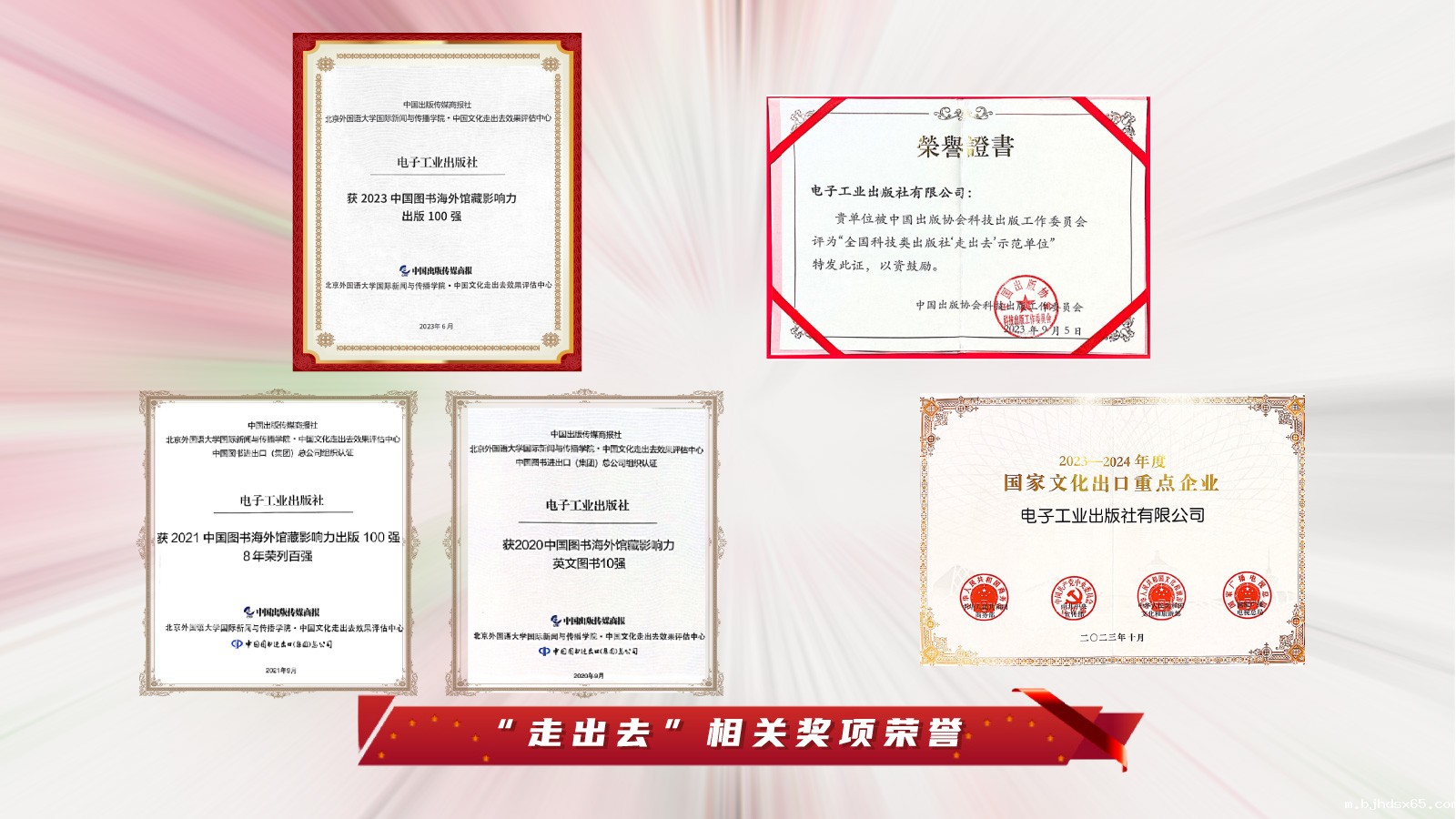 电子工业出版社(以下简称电子社)深入学习贯彻习近平文化思想,把“坚定文化自信,秉持开放包容,坚持守正创新,推动文化繁荣、建设文化强国,不断促进人类文明交流互鉴”作为推动出版国际化的根本遵循。在经济全球化的大背景下,作为国内最早与国外机构开展版权贸易的出版社之一,电子社始终坚持坚持国际化战略,注重开拓国内、国际两个市场,长期与世界知名出版机构开展版权贸易合作;荣获“全国图书版权贸易先进单位”“全国版权输出出版先进单位”“全国科技类出版社‘走出去’示范单位”等称号,被商务部等五部委评为“国家文化出口重点企业”,连续十年获得中国图书海外馆馆藏影响力出版100强,多种图书荣获国家引进版、输出版优秀图书奖。