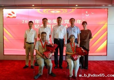 与获得“光荣在党50年”纪念章的两位老党员合影